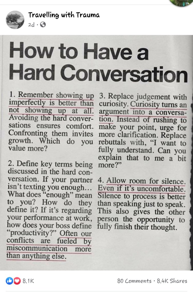 One of the most uncomfortable things for me is a necessary, but hard, conversation. Emotions might run high, clarity might be difficult, there’s no guarantee it will “fix” things, and at the close, we still might be misunderstood.