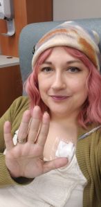 As of this writing, I have completed 5 of my 6 (heavy duty, three-drug cocktail, gnarly) infusions. After the 6th, I will be on one drug, which is known to be NOT heavy duty, NOT gnarly, and – after what I’ve dealt with thus far – comparatively, a walk in the park.